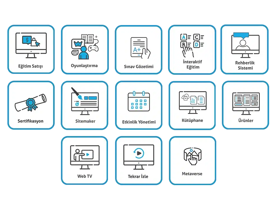 LMS, Live ve Exam paketlerine ek olarak e-ticaret ve sertifika doğrulama modülleri opsiyonel olarak sunulmaktadır.